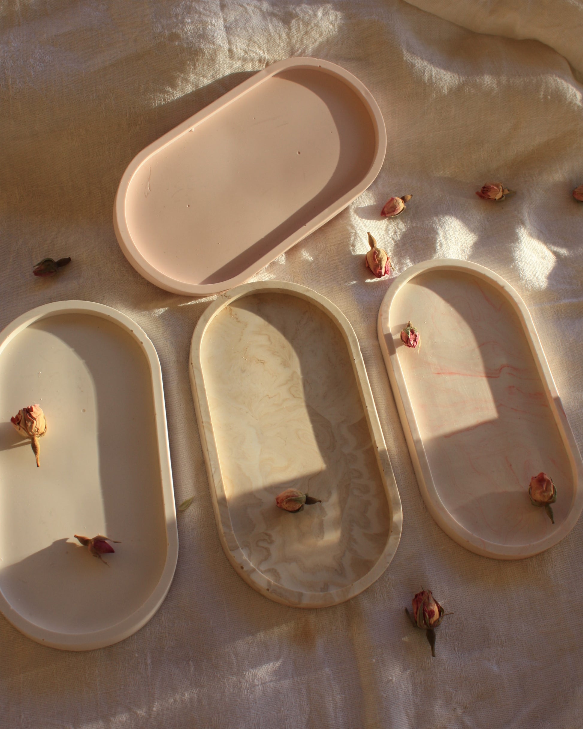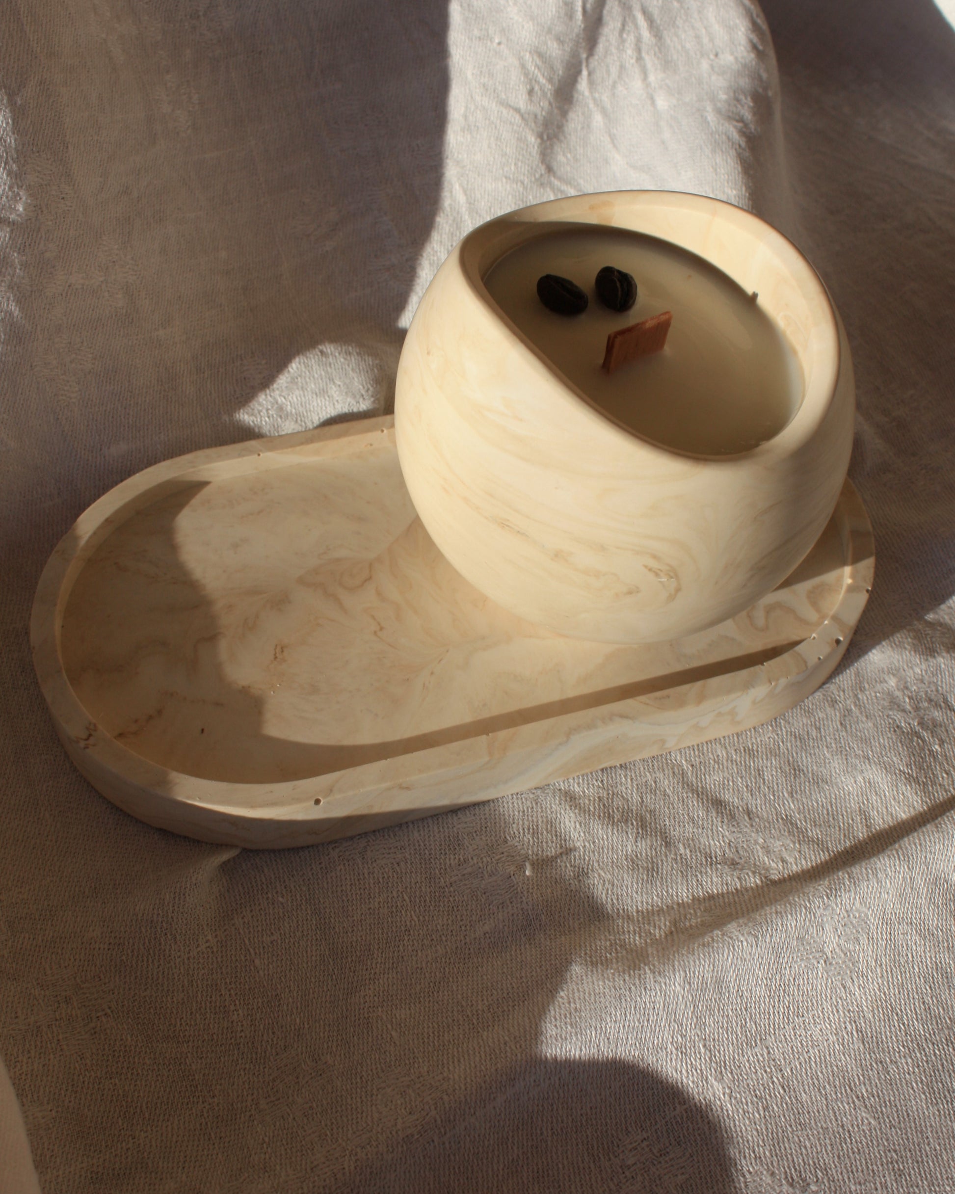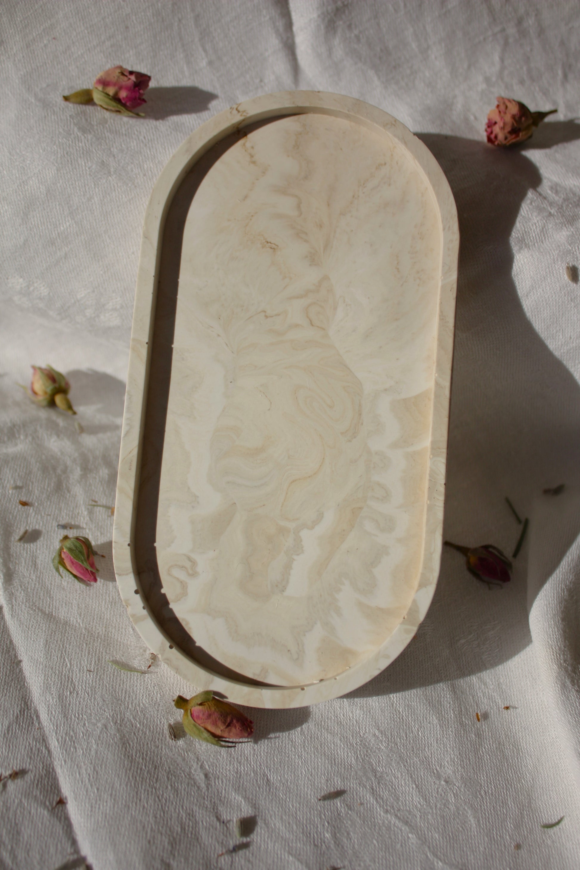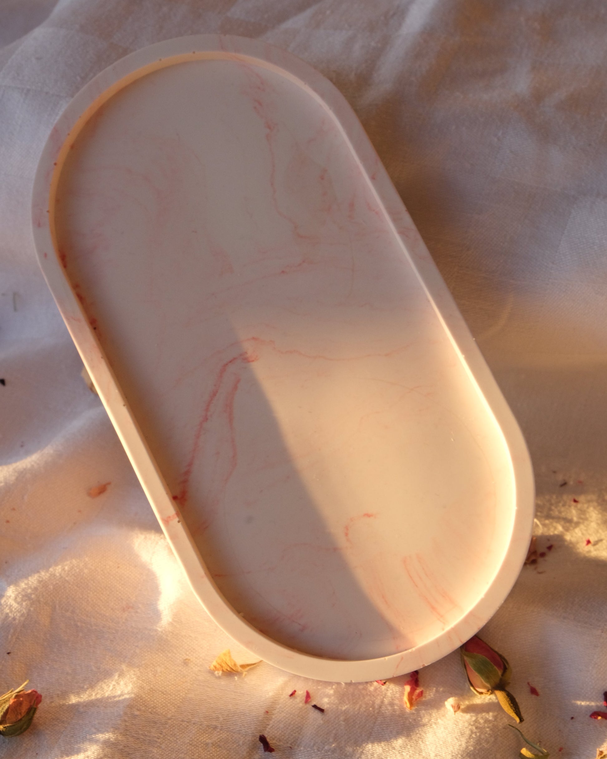 Esta bandeja ovalada, disponible en varios colores (blanco, rosa claro, marrón marmolado y rosa marmolado) con un acabado elegante y minimalista, es ideal para organizar tus espacios favoritos. Perfecta para colocar nuestras velas de soja, joyas, llaves o cualquier otro accesorio.