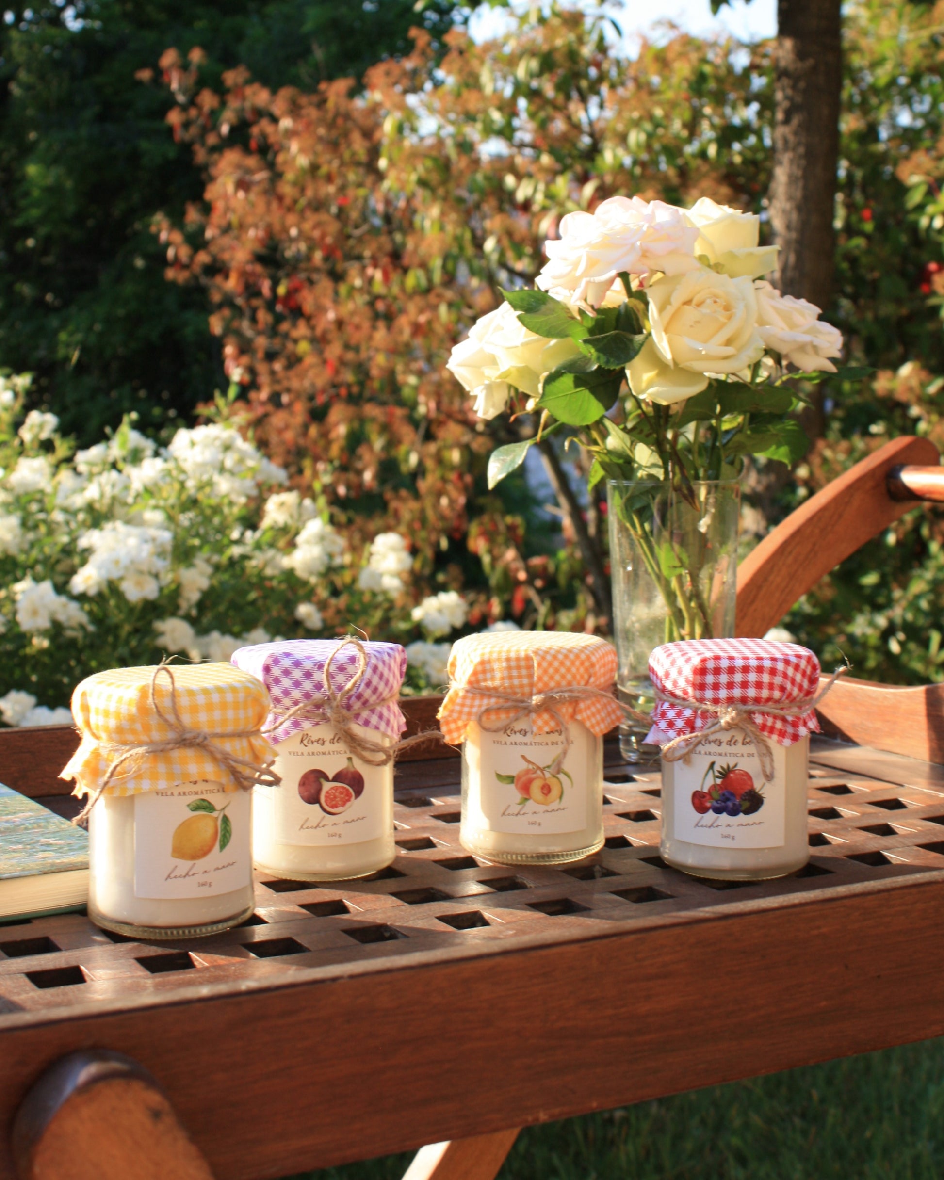 Vela de soja 100% natural de 160 ml en recipiente de vidrio con tapa blanca y tela de cuadros.