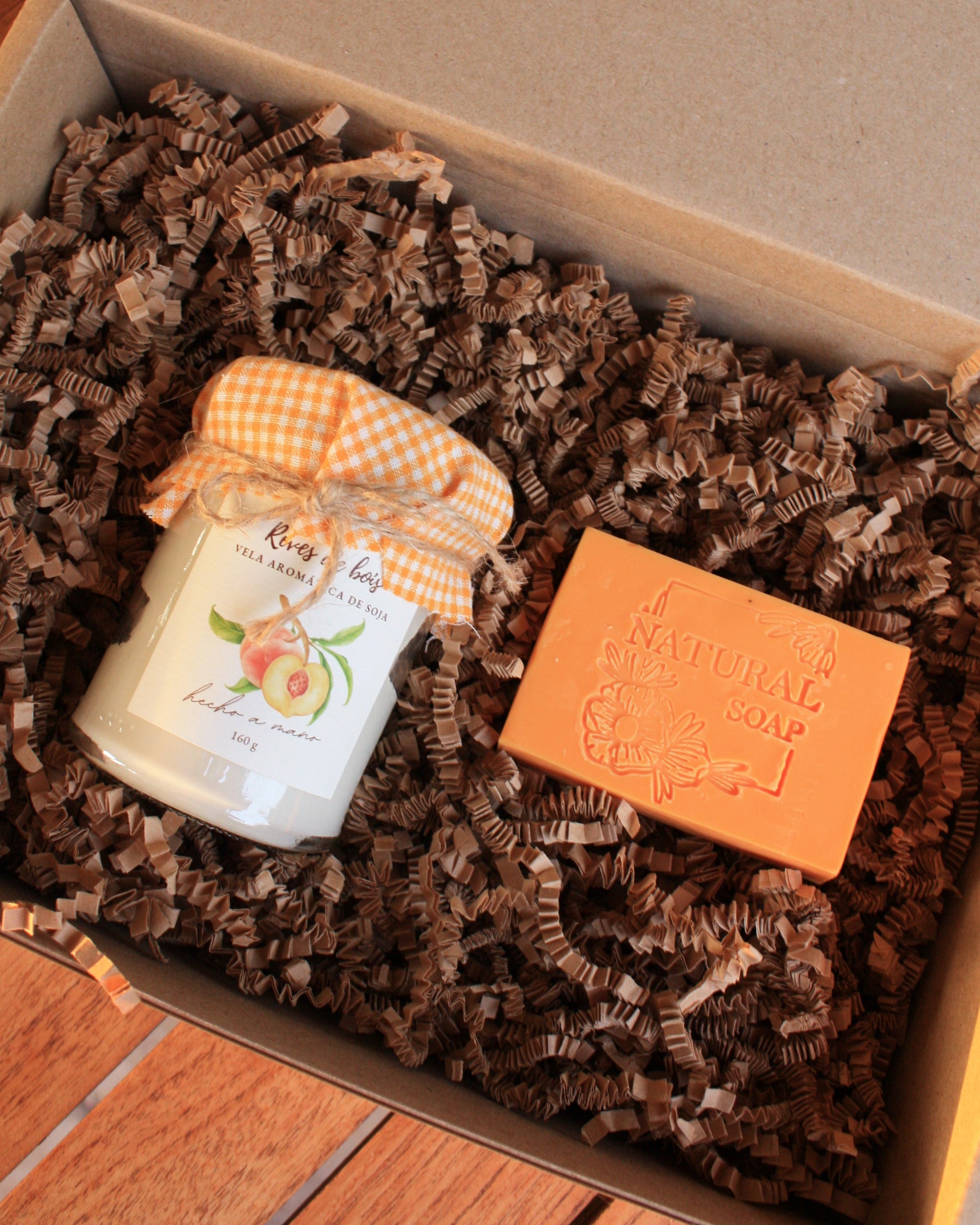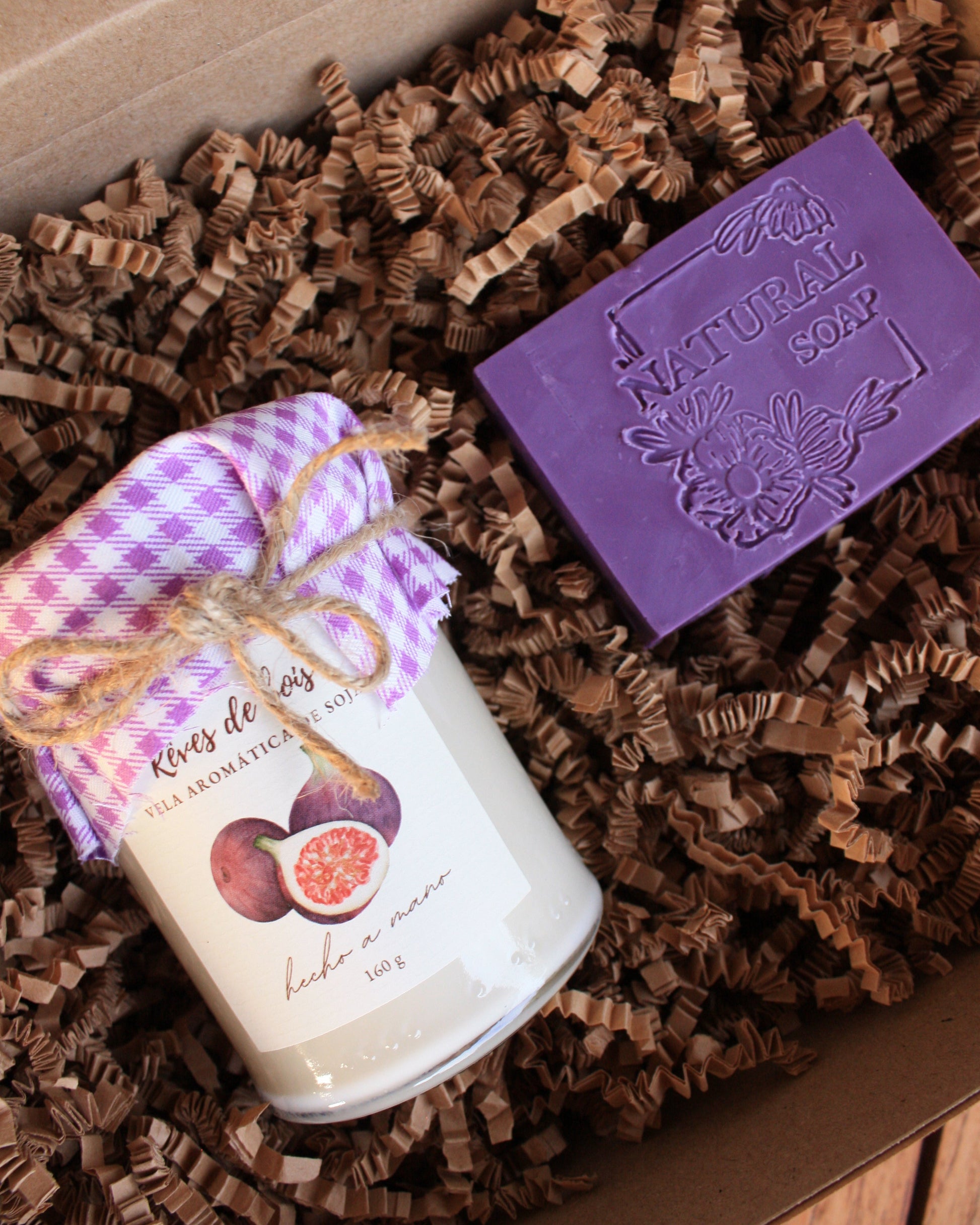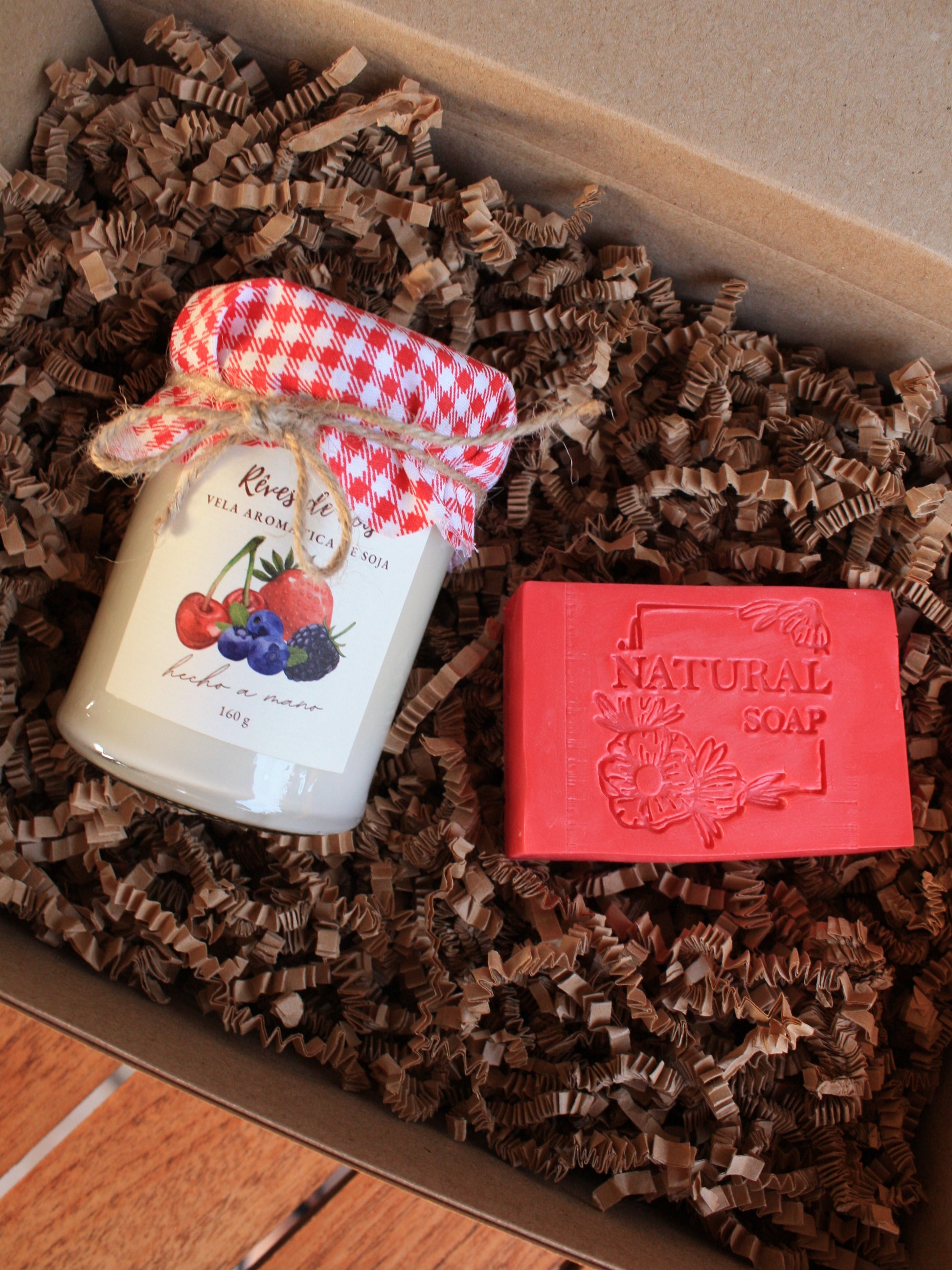 Pack regalo de vela de soja de 160 ml y jabón sólido de manteca de karité. Caja con lazo. A elegir entre 4 aromas frutales