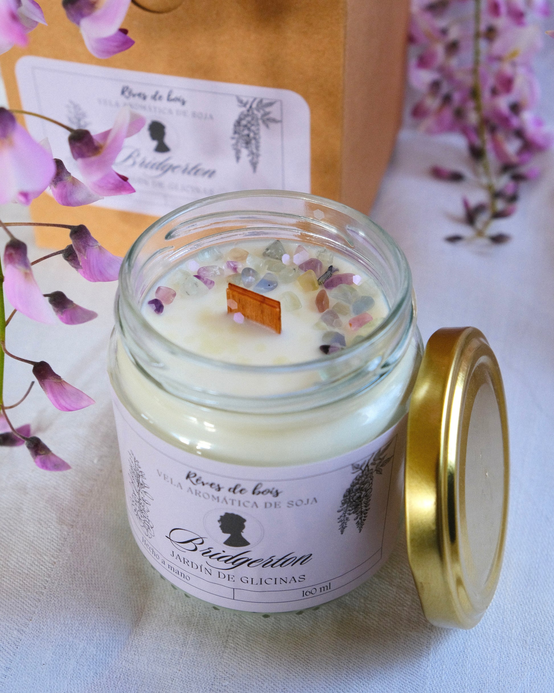 Vela de soja 100% natural en recipiente de vidrio decorada con piedras de fluorita.