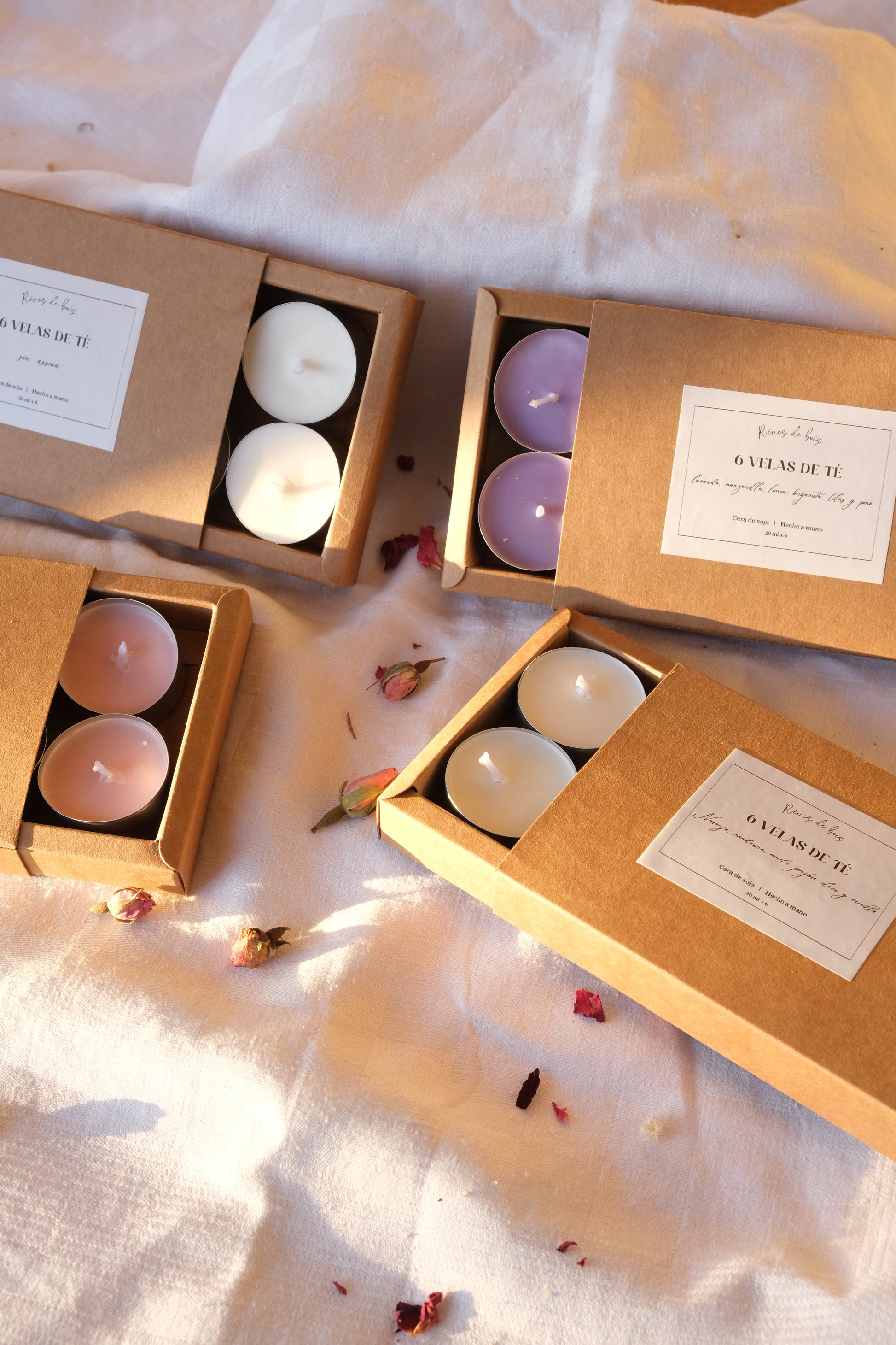 Vela de té de cera de soja 100% vegetal disponible por unidad o en pack de 6 velas.
