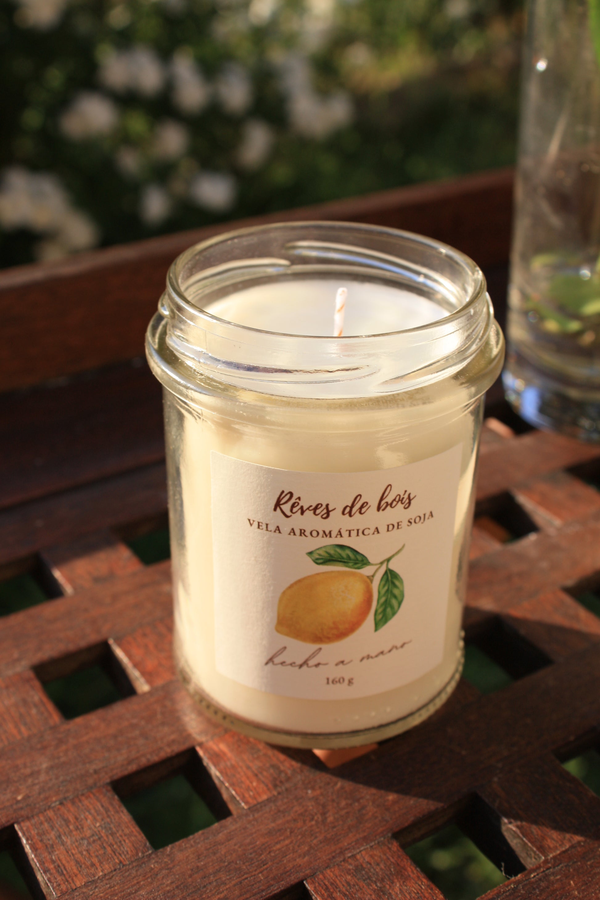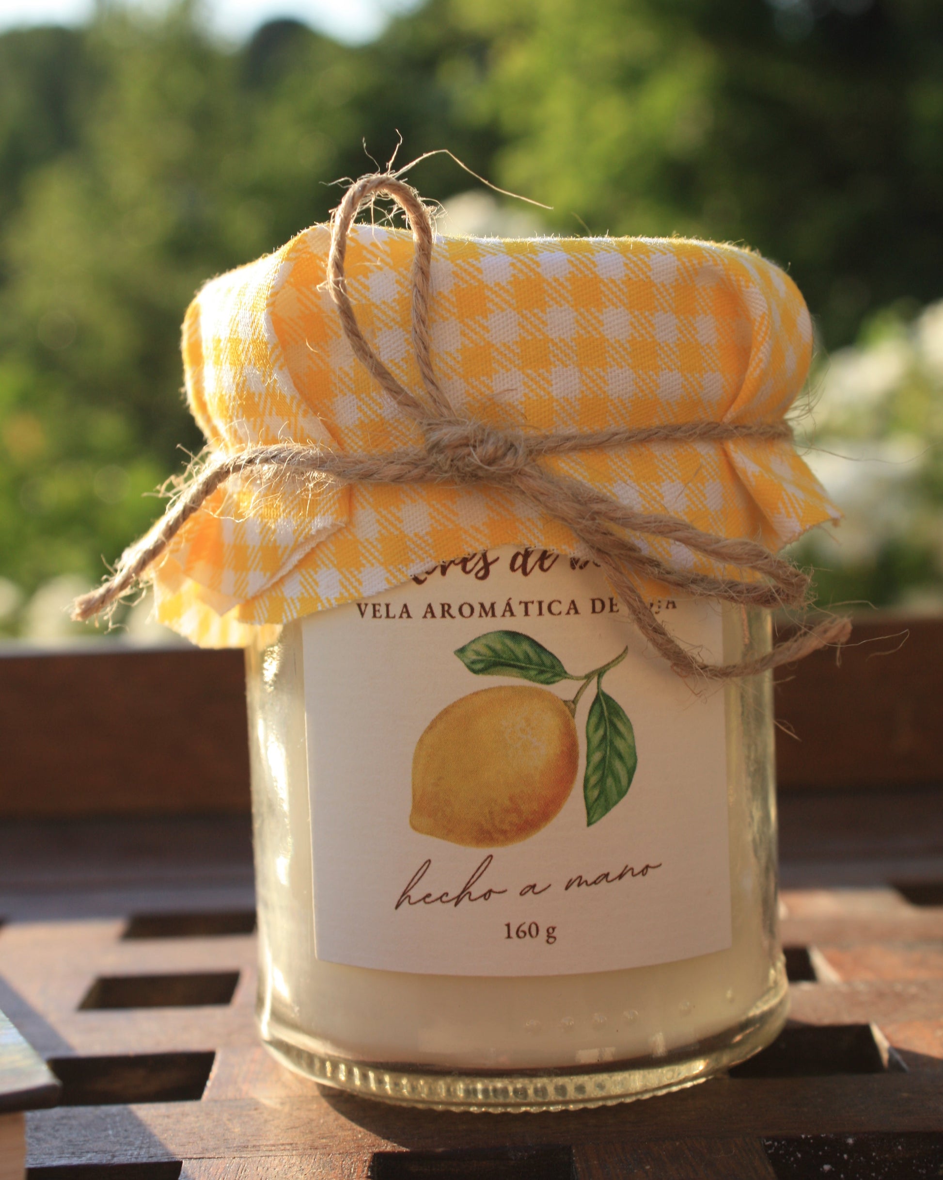 Vela de soja 100% natural de 160 ml en recipiente de vidrio con tapa blanca y tela de cuadros.